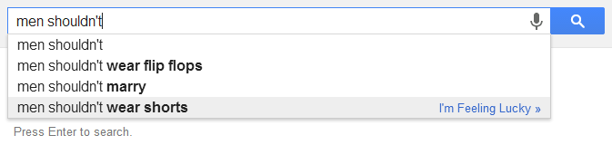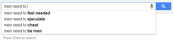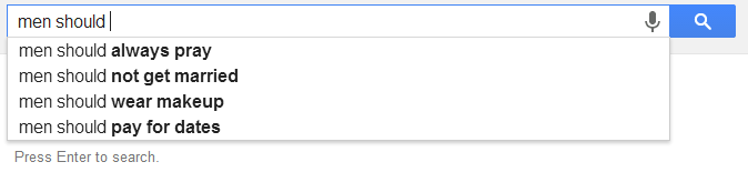 As always, patriarchy harms men too. It is more subtle, but the damage is clear. What men wear is limited by social convention. Their integrity as partners is constantly questioned. Where women are seen as sexual objects, men are told they cannot function without sex. These are harmful stereotypes which need to be amended. Still, none of the results for men suggested that they were undeserving of basic rights or that they shouldn’t be in charge of their own lives.